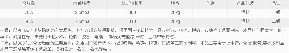主营乳胶再生胶、高强力再生胶、超细再生胶、氯化丁基再生胶、超细无味再生胶、精细无味再生胶、轮胎再生胶等。