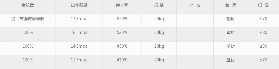 本品以进口米其林,横滨胎顶为主要原料,根据客户需求指标加入部分落地天然胶,采用内较新高压技术,经过筛选、破碎、脱硫、(过滤60目)、精炼成型等工艺而制成,本品粒子微细,拉伸强度高、伸长率大,耐磨性好,门尼粘度低,可以部分或全部替代天然胶,本品无需塑炼、开炼工艺简单具有省时、省工、省电、等特点,大大降低了制品生产成本,本品主要用于:轮胎、桥梁支座、止水带、输送带、需要拉伸强力的制品,我厂可提供高强力再生胶技术配方指导工作,让客户节约时间。以好途径让客户满意使用。